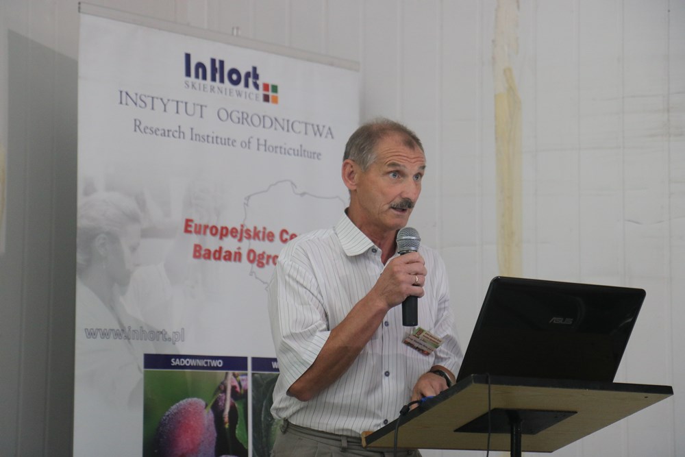 Jak zwykle ciekawy wykład wygłosił dr hab. Stanisław Pluta. Świdośliwa olcholistna nadaje się zarówno do uprawy amatorskiej jak i towarowej. Ze względu na susze w minionym roku wystąpiły obawy co do plonowania w obecnym sezonie. Jednak ze względu na preriowe pochodzenie gatunku okazało się, że kwitnienie w tym roku było na niesamowicie intensywnym poziomie i wszystko wskazuje na to, że plonowanie będzie także bardzo obfite – mówił dr hab. Pluta. Dokonał też przeglądu odmian i ich charakterystyki. Odmiana ‘Honeywood’ wykształca niewiele odrostów, więc jej potencjał plonotwórczy jest ograniczony.