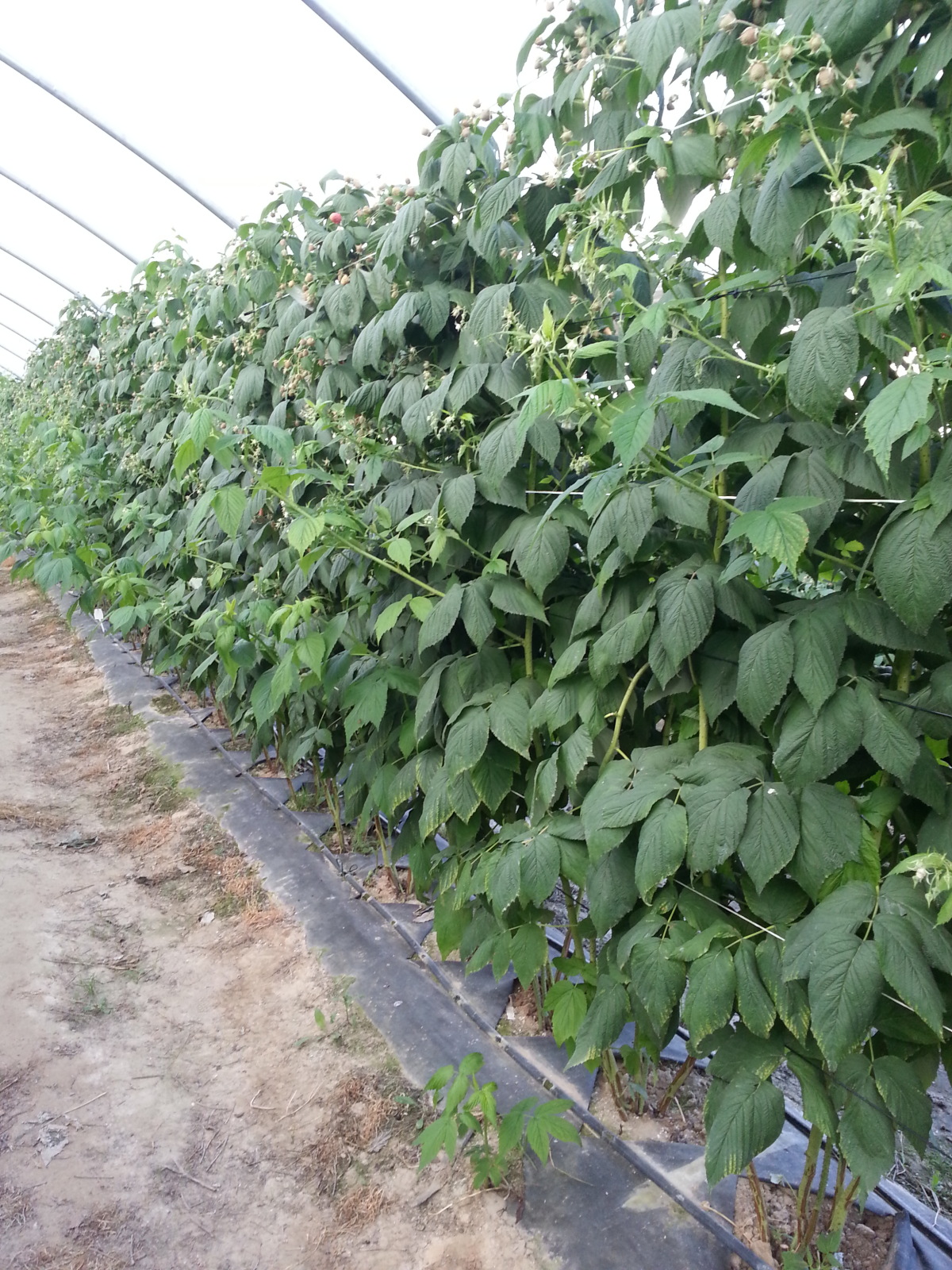 Włóknina rozłożona została za pomocą maszyny, która formuje podniesiony zagon o wysokości 15-25 cm. Maszyna już na etapie rozkładania agrowłókniny nacinała otwory, w które posadzone zostały maliny. W tej technologii uprawy malinę powtarzającą prowadzi się 4-5 pędów z rośliny. Sadzonki doniczkowane maliny zostały posadzone w kilku rozstawach: jeden rząd na zagonie, odległości miedzy roślinami 40cm oraz w systemie pasowo-rzędowym: dwa rzędy na zagonie, odległości między roślinami 33 cm, a między rzędami 33cm.