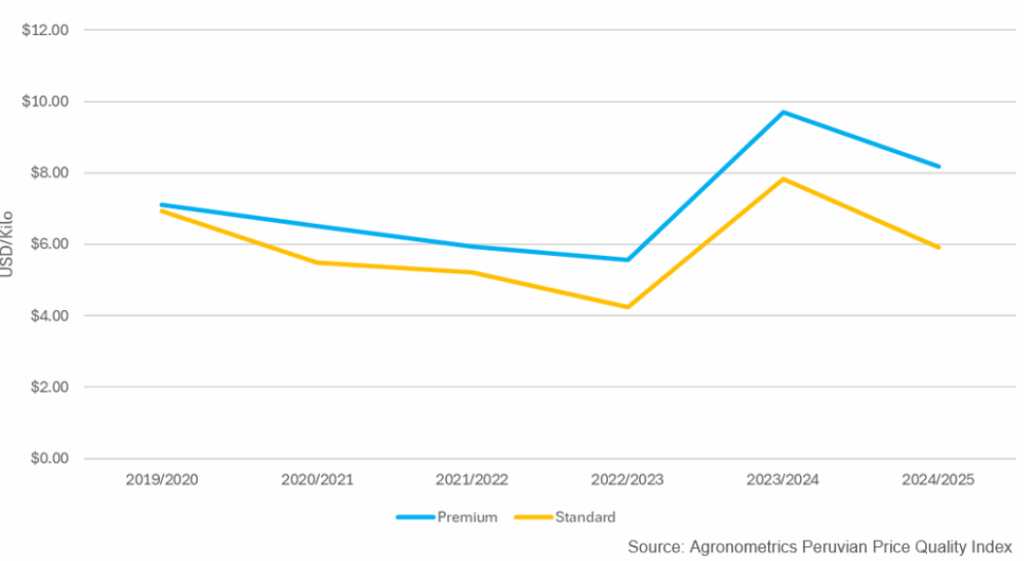 Wskaźnik jakości cen (PQI) to opatentowana metoda opracowana w celu ilościowego określenia zależności między odmianą a ceną, oparta na danych eksportowych z sześciu sezonów, dostarczanych przez peruwiański urząd skarbowo-celny (SUNAT). Tylko za sezon 2024/2025 uwzględniono 32,752 pozycji eksportowych.