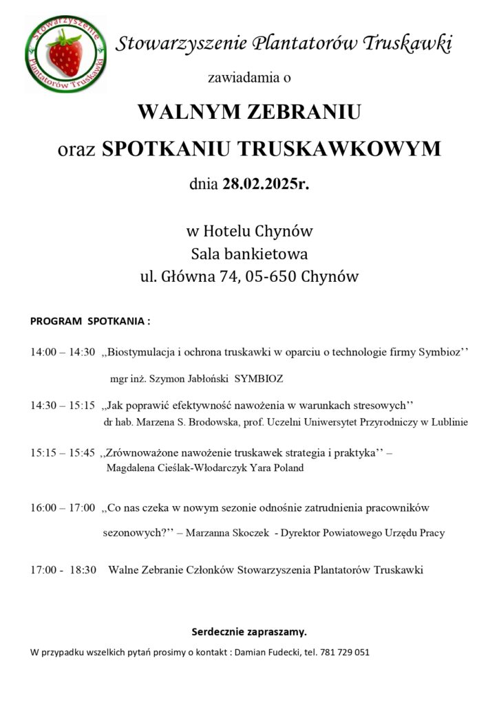 Stowarzyszenie Plantatorów Truskawki zawiadamia o walnym zebraniu oraz spotkaniu truskawkowym, które odbędzie się dnia 28 lutego 2025 r. w Hotelu Chynów (Sala bankietowa) ul. Główna 74, 05-650 Chynów.