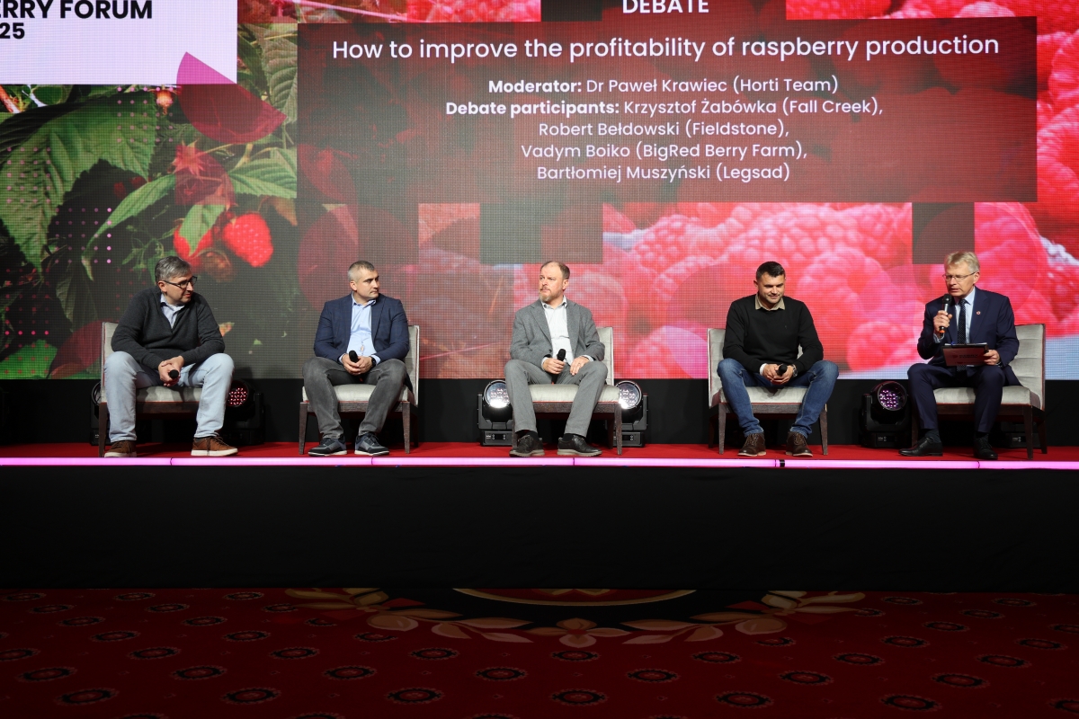 Zwiększenie rentowności produkcji malin w dobie rosnących kosztów, a także wyzwań wynikających m.in. z ograniczania liczby środków ochrony roślin oraz zmian klimatycznych jest tematem, który spędza sen z powiek wielu plantatorom. O sposobach na zwiększenie opłacalności uprawy dyskutowali podczas Berry Forum 2025 Krzysztof Żabówka z firmy Fall Creek, Robert Bełdowski z firmy Fieldstone Investments a Family Farm, Vadym Boiko reprezentujący firmę BigRed Berry Farm oraz Bartłomiej Muszyński z firmy Legsad. Debatę poprowadził dr Paweł Krawiec.