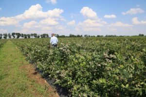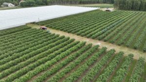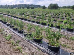 Na początku czerwca ubiegłego roku odwiedziłem gospodarstwo Agro-Berry, prowadzone przez Klaudię Lange-Kurlapską i Łukasza Kurlapskiego. Już na pierwszy rzut oka było widać, że plantacja przeszła w ostatnich latach ogromną zmianę. Krzewy borówki w rzędach były wyrównane, silne, miały intensywnie zielone, zdrowe liście. Najbardziej widoczne było jednak obłożenie roślin owocami – pędy w wielu miejscach uginały się pod ich ciężarem. Na niektórych kwaterach konieczne było nawet stosowanie podpór, aby utrzymać pionowy pokrój krzewów.