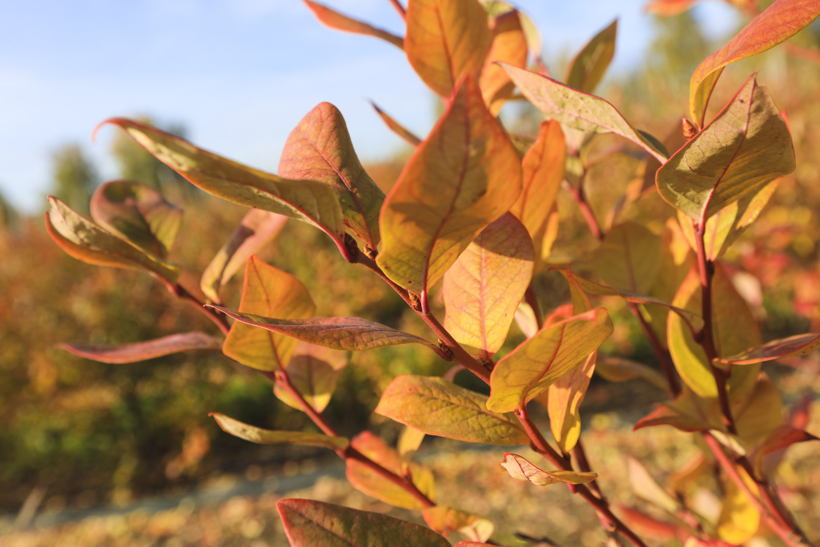 To właśnie dlatego plantacje borówek jesienią stają się tak malownicze i różnorodne. W zależności od odmiany, stanowiska i pogody, liście mogą przybierać zupełnie inne barwy – od jasnozłotych po głęboko bordowe.