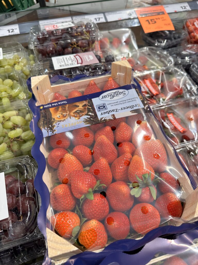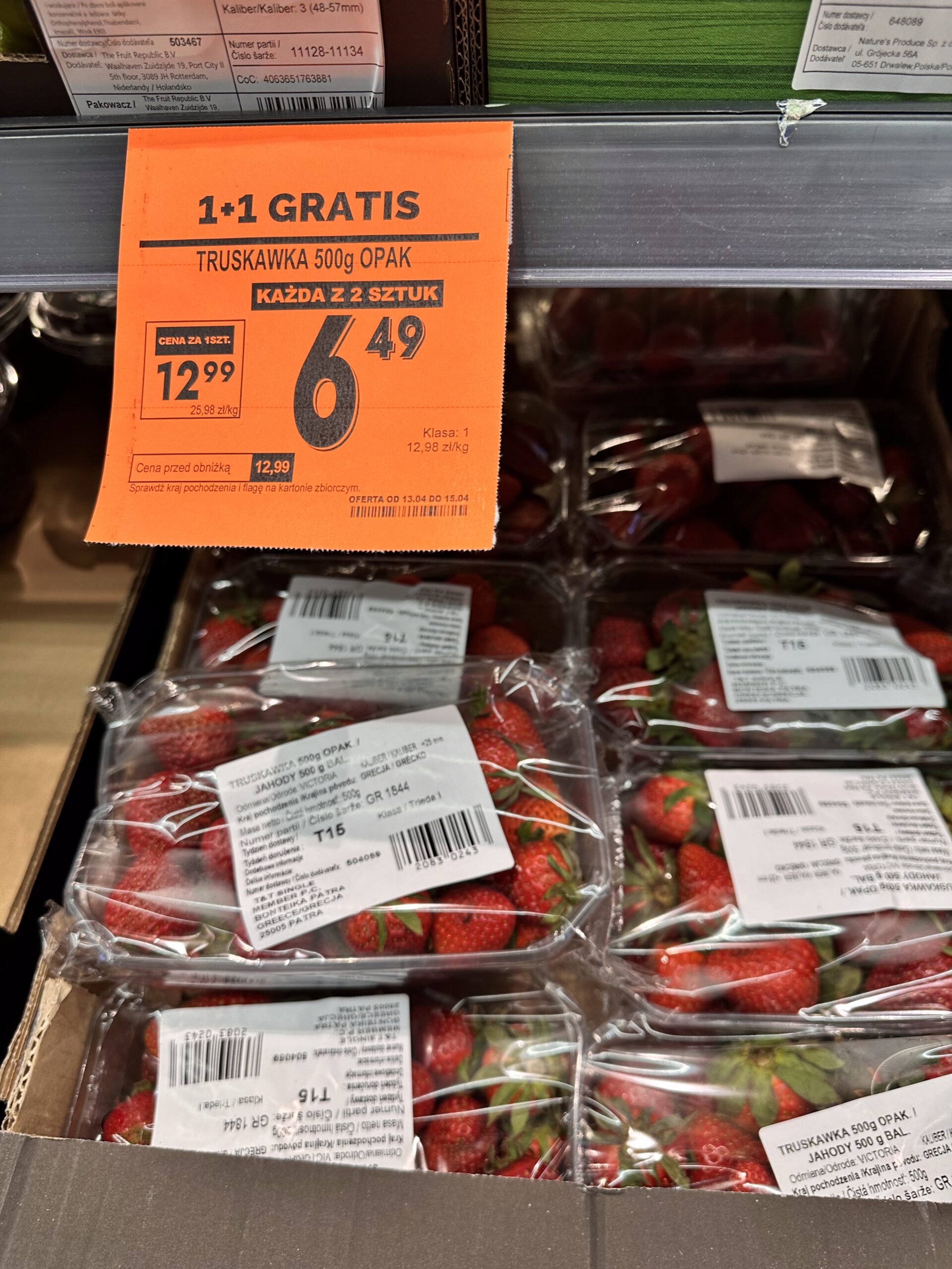 W jednym ze sklepów tej sieci spotkaliśmy owoce zarówno z Grecji, jak i Hiszpanii. Niestety te pierwsze były już słabej jakości i trudno ocenić, czy z dwóch opakowań udałoby się wybrać jedno w pełni satysfakcjonujące. Zdecydowanie lepiej prezentowały się truskawki z Hiszpanii – ich smak i wygląd były na zadowalającym poziomie. Mimo to, nawet w starannie wybranym opakowaniu, po otwarciu trzeba było wyrzucić kilka owoców.