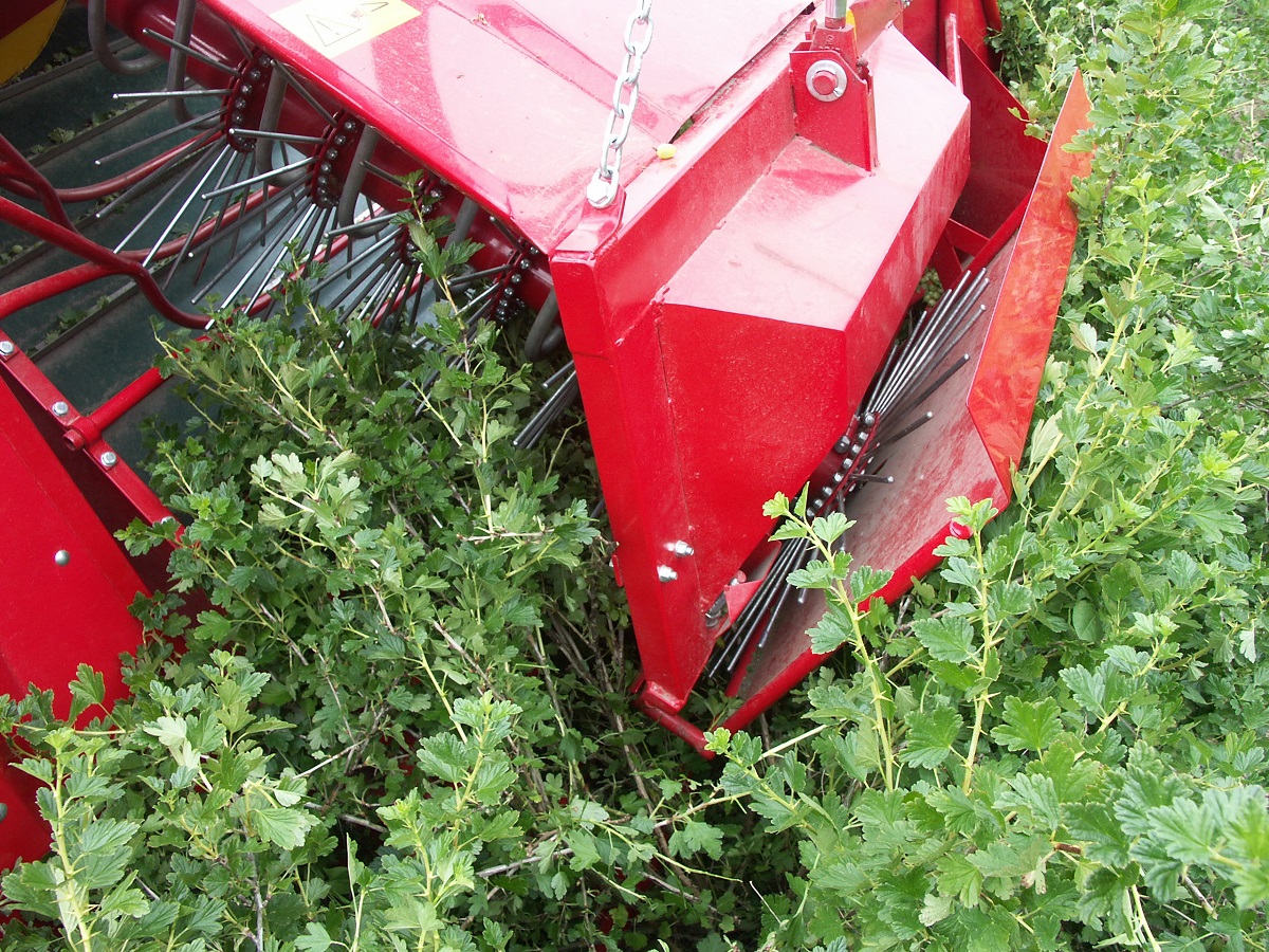 Rząd krzewów dzielony jest na pół i wprowadzany za pomocą podbieraków do zespołu otrząsającego. Owoce spadając na transportery są przenoszone przez zespół oczyszczający, gdzie dokładnie usuwane są liście i inne zanieczyszczenia. W zależności od przeznaczenia owoców i wymagań końcowych odbiorców, owoce są zbierane do małych 10-20 kg skrzynek lub do 500 kg skrzyń. Skrzynie są rozładowywane z platformy roboczej wózkiem widłowym ale mogą być również zsuwane po zjazdach rolkowych, czy opuszczane na ziemię za pomocą windy hydraulicznej. W kombajnach całorzędowych samojezdnych, owoce mogę być również zbierane do pojemników jadących na platformach w rzędzie obok.