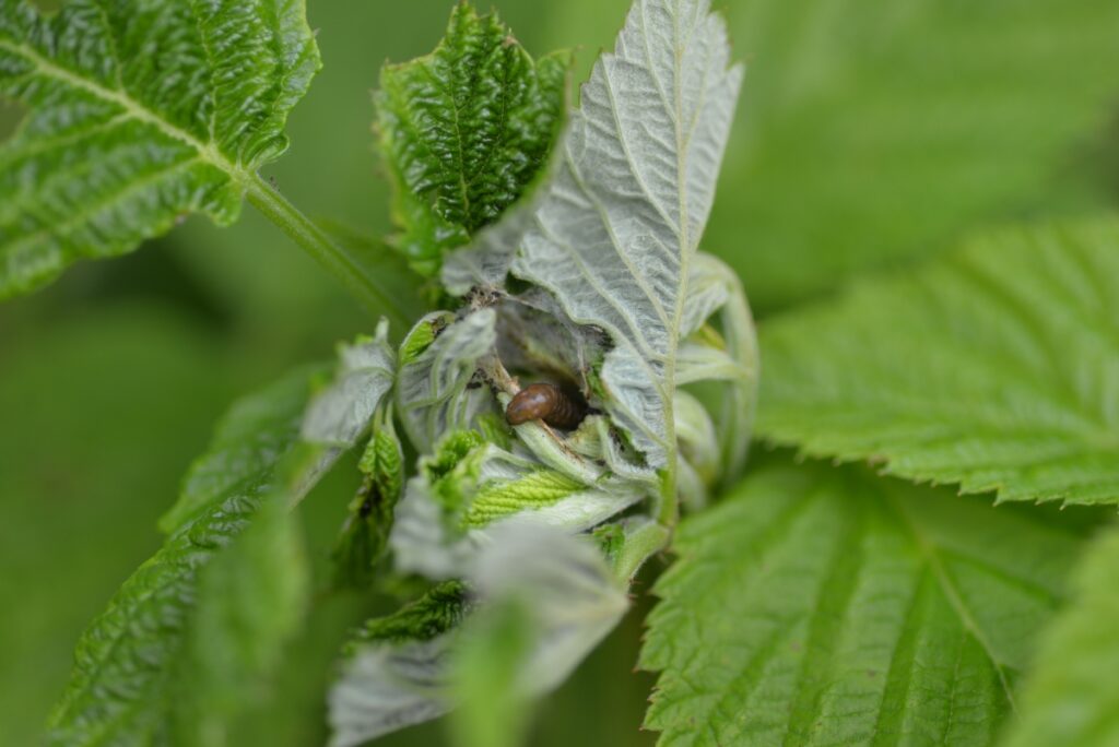 - Szpeciel przebarwiacz malinowy – występuje głównie na odmianie ‘Glen Ample’, progiem zagrożenia jest obecność pojedynczych szpecieli na plantacji. Przebarwiacz malinowy jest wektorem wirusa plamistości liści maliny.