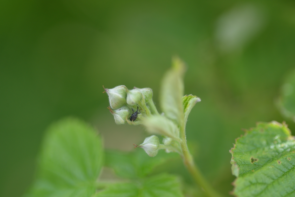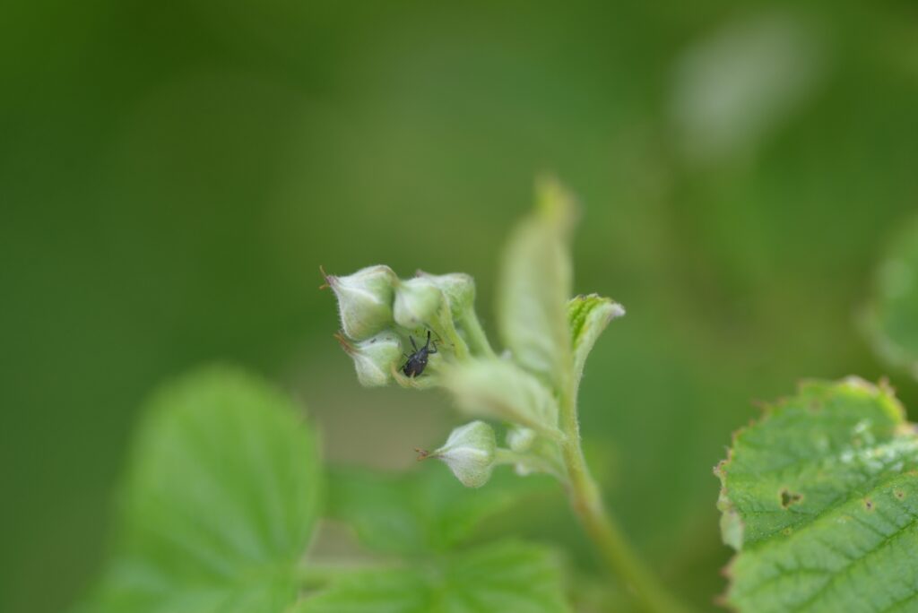 - Kwieciak malinowiec – na plantacjach malin prowadzonych na zbiór letni obserwuje się osobniki dorosłe kwieciaka malinowca i podcięte pąki kwiatowe, w których samice złożyły jaja (fot. 8-9). Obecnie należy prowadzić lustracje pod kątem obecności tego szkodnika. Na początku kwitnienia próg zagrożenia stanowi liczba 2 chrząszczy na 200 kwiatostanów.