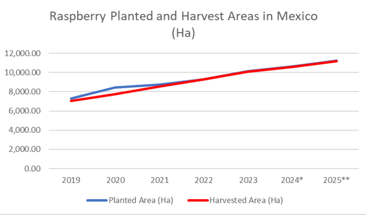 Sektor malinowy w Meksyku stale się rozwija, obejmując coraz szersze obszary kraju. Powierzchnia upraw w 2025 roku ma osiągnąć 11 220 hektarów. Produkcja rośnie od 2019 roku, osiągając rekordowy poziom ponad 190 000 ton w 2023 roku (obecnie przekroczony).
