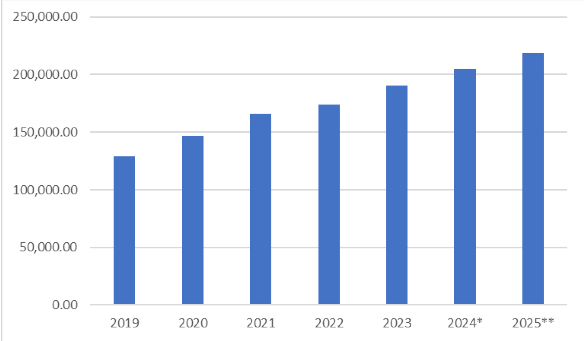Produkcja malin w Meksyku dynamicznie rośnie. Szacuje się, że w 2025 roku osiągnie 219 000 ton, co oznacza 7% wzrostu w porównaniu do 2024 roku (205 000 ton). Ten imponujący wynik to efekt doskonalenia systemów nawadniania, utrzymania wykwalifikowanych pracowników oraz zwiększania powierzchni upraw.