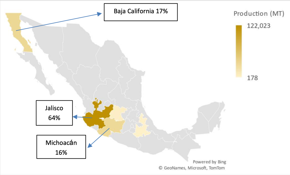 Centralne meksykańskie stany Jalisco i Michoacán produkują od listopada do początku czerwca, a Baja California od sierpnia do października, zapewniając niemal całoroczną podaż.