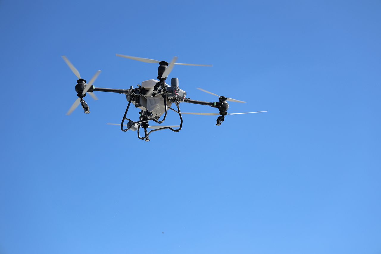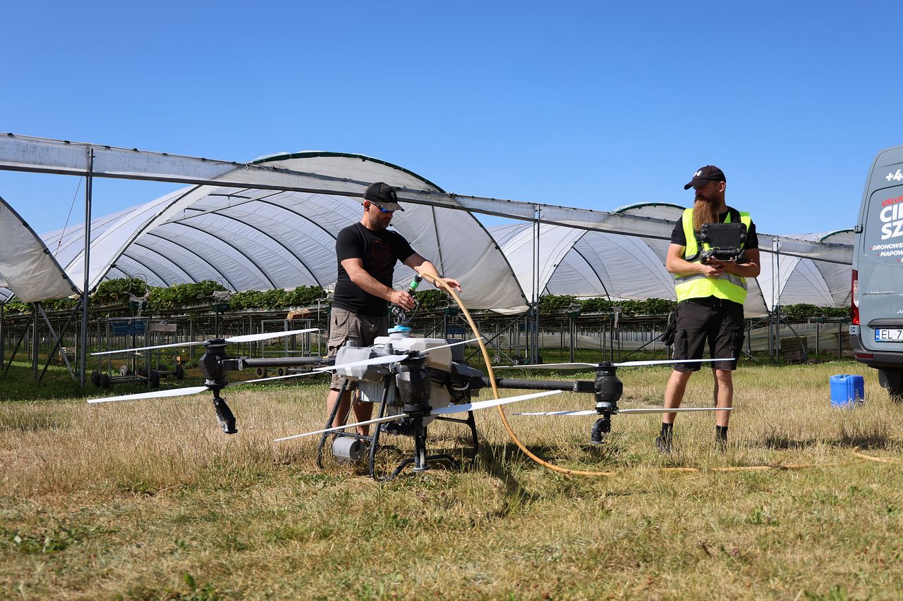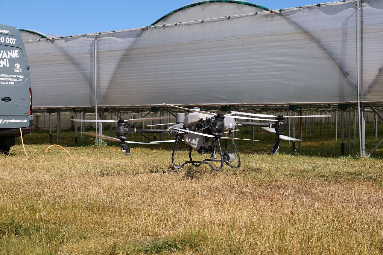 W Radzanowie firma Agrodron przeprowadziła pokaz z wykorzystaniem drona DJI Agras T50 – największego modelu dostępnego w Europie, przystosowanego do precyzyjnej aplikacji środków. Kluczowe jest tu zastosowanie wirujących dysków atomizerów, które nie rozpylają cieczy pod ciśnieniem, lecz za pomocą siły odśrodkowej, co pozwala uzyskać krople o średnicy 290–480 mikronów – idealne do aplikacji środków cieniujących.