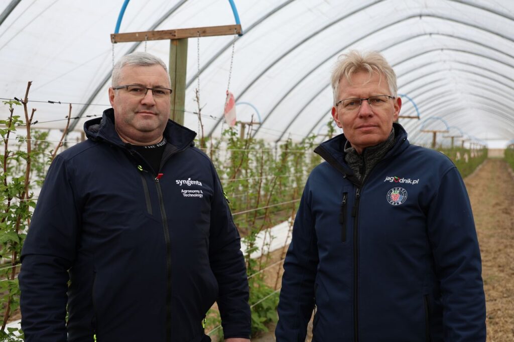 W kwaterze odmiany 'Enrosadira’ prowadzonej w ramach projektu Malinowe Factory na zbiór letni wiele się dzieje. Plantacja założona w połowie kwietnia ubiegłego roku przeszła zimę stosunkowo dobrze, choć – jak co roku – nie obyło się bez uszkodzeń wiązek przewodzących. Dr Paweł Krawiec podkreśla, że to praktycznie standardowe zjawisko w uprawie malin: początek wegetacji rzadko oznacza całkowicie zdrowe tkanki przewodzące. Właśnie dlatego pierwsze tygodnie sezonu powinny koncentrować się na regeneracji, ale nie można zaniedbać zabiegów ochronnych. Swoje rozwiązania w tym zakresie przedstawiła firma Syngenta.