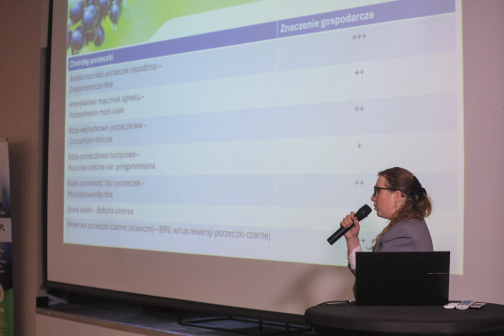 Karolina Felczak-Konarska z firmy Porcam przedstawiła najważniejsze choroby porzeczek: antraknozę liści, mączniaka amerykańskiego, rdzę, białą plamistość liści, szarą pleśń oraz rewersję porzeczek. Podkreślano znaczenie profilaktyki, usuwania resztek roślinnych oraz wzmacniania odporności roślin m.in. poprzez nawożenie krzemowe.