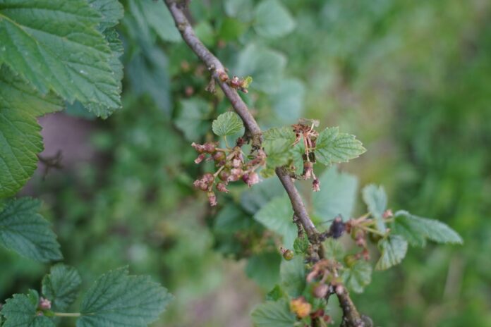 Na plantacjach zlokalizowanych w województwie lubelskim krzewy porzeczki czarnej (‘Tisel’, ‘Ruben’) i czerwonej (‘Rolan’, ‘Rovada’) znajdują się w fazie wzrostu owoców – BBCH 74-76 (fot. 1-3). Na plantacjach porzeczki czarnej obserwuje się objawy uszkodzeń poporzymrozkowych w postaci przebarwionych, skorkowaciałych i ograniczonych we wzroście zawiązków (fot. 4.).