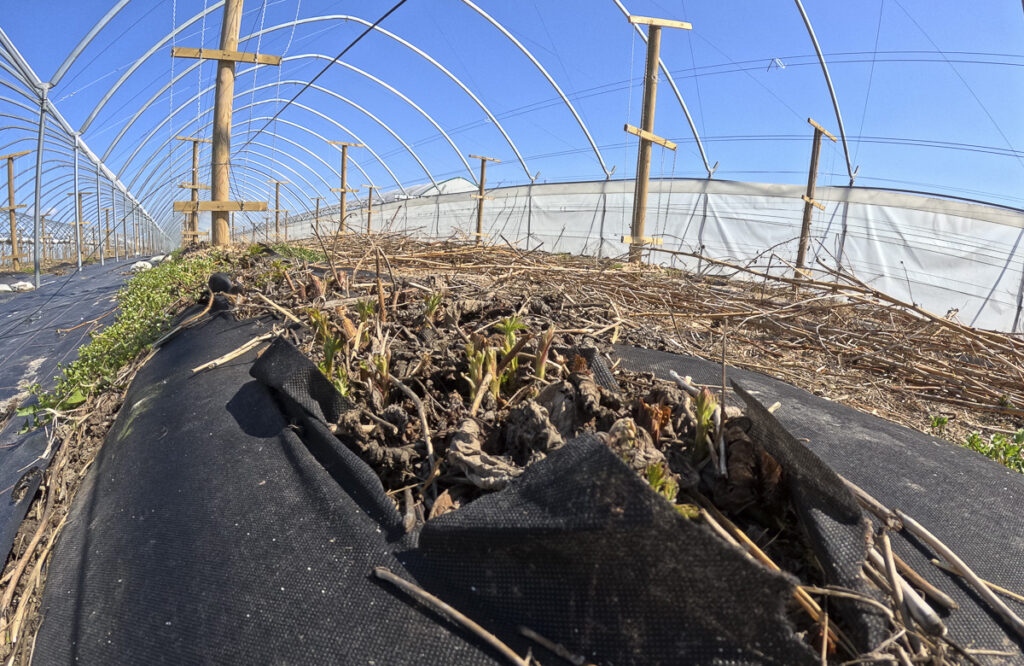 Na naszej plantacji mieliśmy w zimie kolejny kataklizm. Tunele foliowe, w których zimowały maliny (long cane) prowadzone na zbiór letni załamały się pod naporem śniegu. Musieliśmy zdemontować folię i część konstrukcji. Rośliny zimowały tak jak w otwartym gruncie. To spowodowało duże uszkodzenia pąków zarówno w zimie jak i ostatnich tygodniach, kiedy to mieliśmy spore spadki temperatury (do -7C przy gruncie) – informuje dr Paweł Krawiec, prowadzący gospodarstwo jagodowe w Karczmiskach. Choć wydało się, że wiosną pędy rozwijają się normalni i pojawiają się nowe przyrosty, to szczegółowa ocena pokazał iż skala przemarznięć jest znacząca. W przypadku long cane na odmianie Enrosadira uszkodzonych zostało 75% pąków, na odmianie Majestic – 95% uszkodzeń. W takiej sytuacji nie warto podejmować próby regeneracji uszkodzeń – niewiele one pomogą a koszty prowadzenia takiej plantacji, przy perspektywie niskich plonów i marnej jakości owoców będą zbyt wysokie. Pędy dwuletnie wycięto, a plantacja będzie prowadzona tylko na zbiór jesienny.