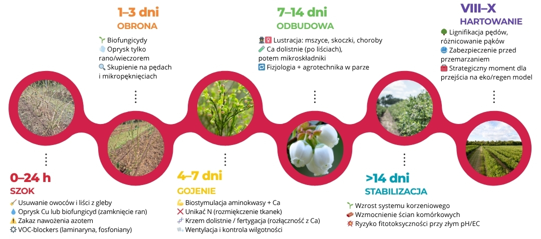 Lustracja krzewów pozwala na szybką identyfikację problemów, natomiast przy aktywnej masie liściowej możliwe jest podanie niskiej dawki saletry wapniowej. Po kolejnych, minimum 48 godzinach wskazany jest zabieg dolistny mikroelementami (np. Fe-EDDHA, Mn, Zn), które wspomagają odbudowę metabolizmu. Te dwa poziomy: fizjologiczny i agrotechniczny muszą iść w parze, aby zapewnić skuteczną i bezpieczną odbudowę plantacji.