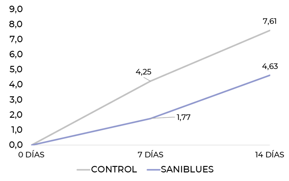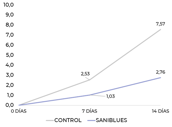Zastosowanie preparatu SaniBlues pozwala uzyskać mniejszy odsetek gnicia w okresie od 7 do 14 dni w porównaniu z kontrolą (niepoddanymi zabiegowi borówkami).