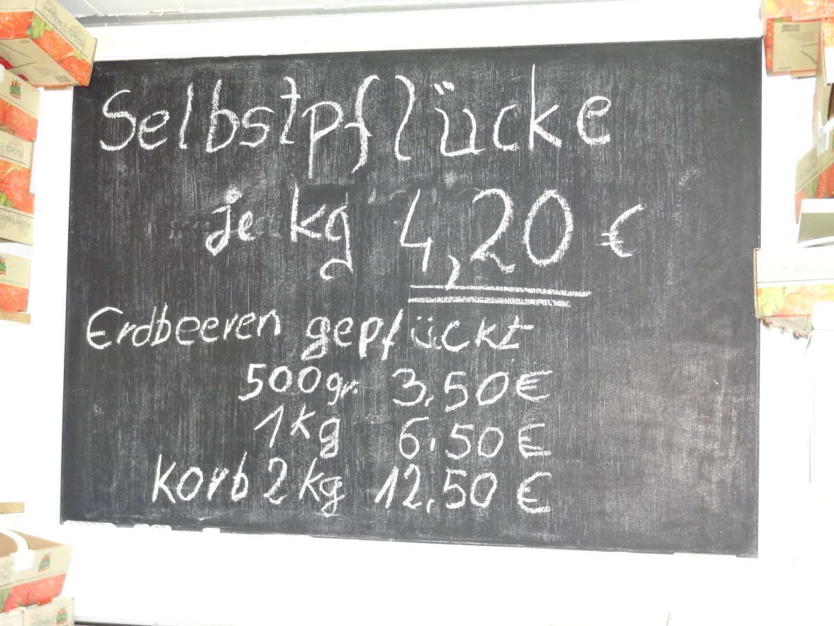 Ten kto nie ma ochoty sam zbierać truskawek może kupić owoce już wcześniej zerwane. Te oferowane są w kolorowych opakowaniach o różnej masie owoców. Największą atrakcją jest jednak możliwość własnoręcznego zbierania owoców. Na plantacji podczas samodzielnego zbioru truskawek można było zobaczyć całe rodziny. Najwięcej radości zbiór ulubionych owoców sprawiał dzieciom. Po nazbieraniu truskawek zanosi się je do punktu sprzedaży gdzie są ważone. Do ceny uzbieranych owoców doliczana jest cena opakowania. Cena samodzielnie zebranych owoców na tej plantacji wynosiła w dniu dzisiejszym 4,2 euro/kg, za wcześniej zerwane owoce trzeba było zapłacić minimum 2 euro za kilogram więcej.