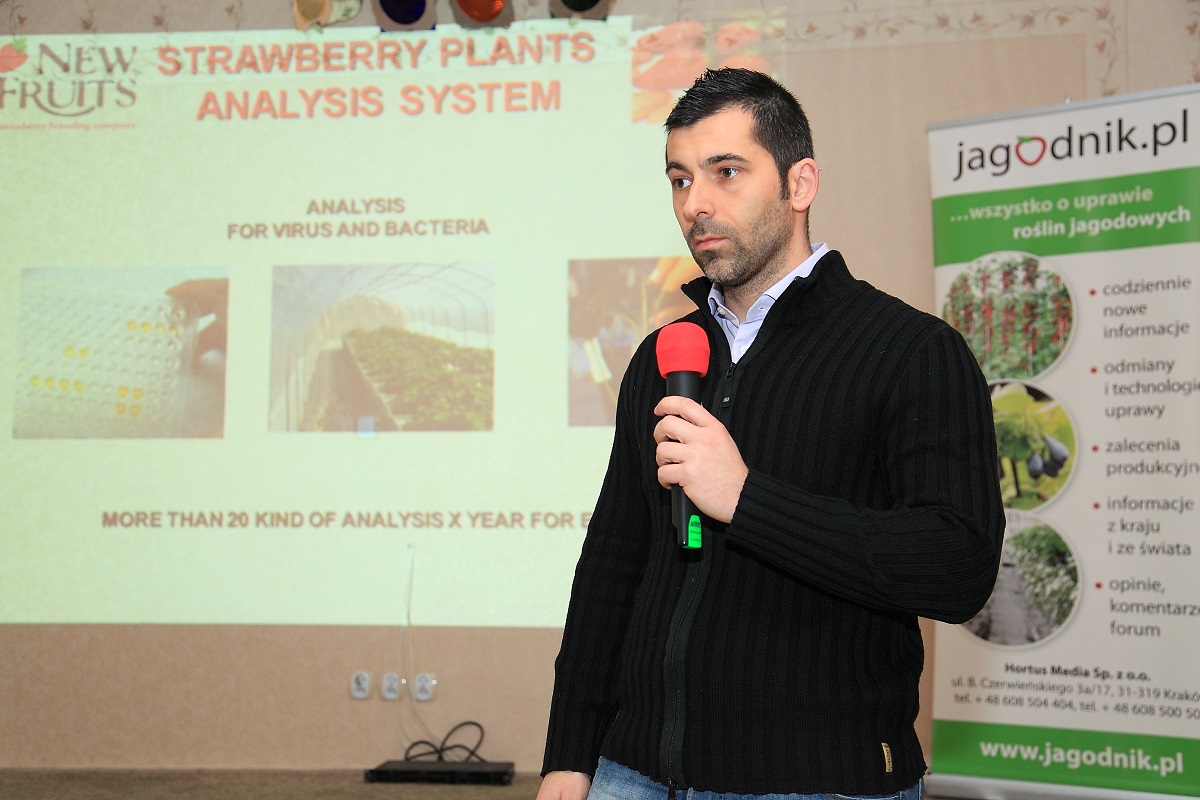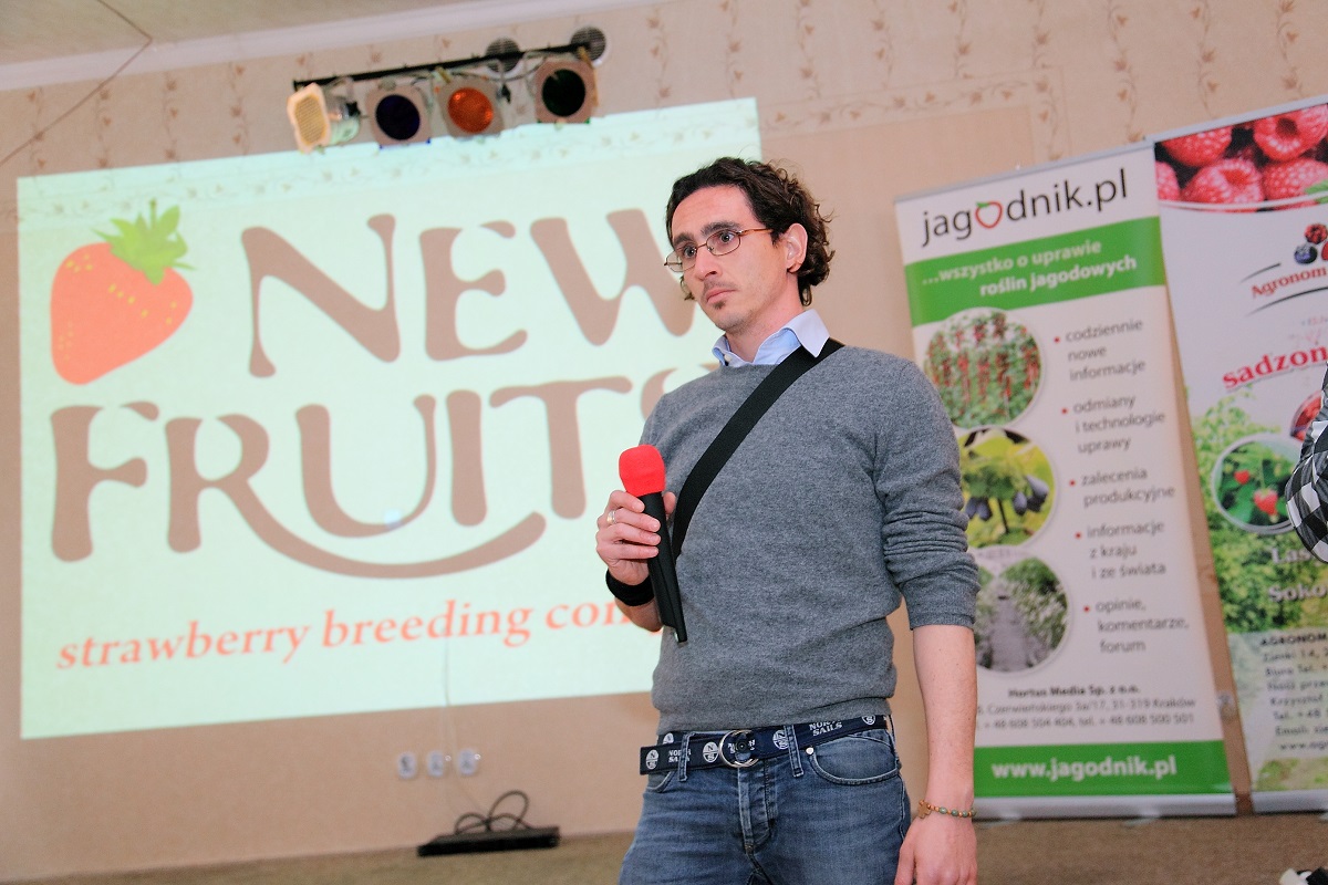 odmiany truskawek, z których w Polsce znane są już 'Roxana’, 'Alba’ czy 'Azja’. Jak informował Andrea Casadei firma, którą reprezentuje realizuje także program hodowli odmian powtarzających owocowanie z którego wywodzą się takie kreacje jak 'Telma’ i 'Luise’. Od 2004 roku w New Fruits realizowana jest także hodowla odmian z przeznaczeniem owoców do przetwórstwa z którego pochodzi 'Syria’. W realizowanych przez tą firmę programach hodowlanych zwraca się uwagę na to aby nowe odmiany były przystosowane m.in. do uprawy w warunkach klimatu kontynentalnego, owoce były duże i miały kształt wydłużonego stożka, a system korzeniowy roślin był jak najbardziej odporny na choroby. Z kolei Michele Montanari omówił zasady produkcji sadzonek w tej firmie oraz rolę wysokiej jakości