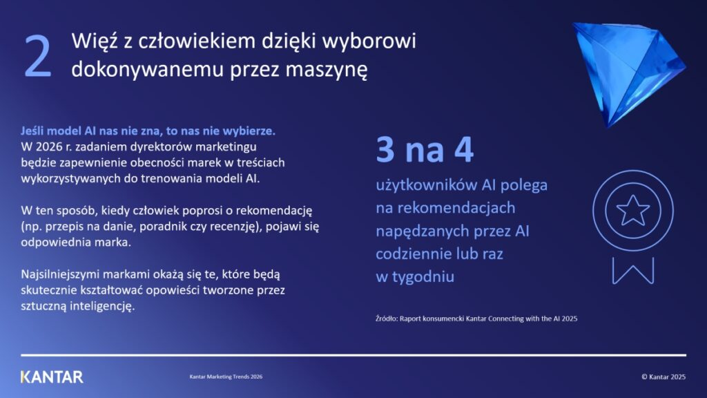 Rekomendacje AI wpływają na decyzje zakupowe. Według Kantara 3 na 4 użytkowników bierze je pod uwagę przy wyborze produktów. Aby być „w orbicie rekomendacji”, marki muszą dostarczać treści, które AI może zacytować i polecić: poradniki, recenzje, przepisy, materiały edukacyjne.