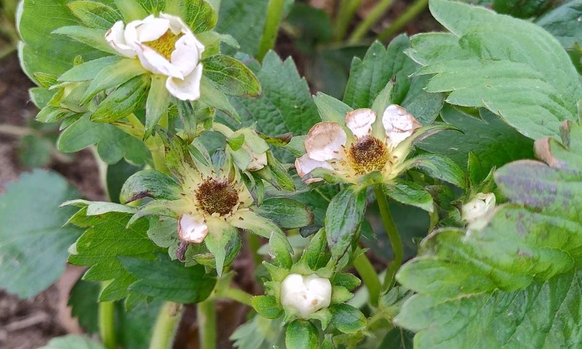 Po ostatnich przymrozkach mamy wiele czarnych kwiatów, te już nie ozdrowieją. Są jednak też takie kwiaty, które są uszkodzone, ale dalej się rozwijają. Tam warto sięgnąć po zabiegi regeneracyjne aby „wyciągnąć” z nich jak największe owoce. Ponadto uszkodzeniu uległy również liście, a tam gdzie były okrywane tkaniną na blaszce liściowej pojawia się wiele otarć. Wskazane jest zatem wdrożenie do zabiegów nalistnych biostymulującego Kelpaku, który genialnie wpływa na regenerację kwiatów i reguluje proces kwitnienia ale także sprzyja regeneracji części zielonych. W mieszaninie można jednocześnie podać Asahi jak i antystresant.