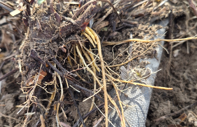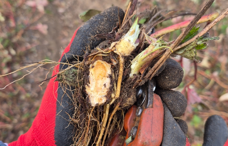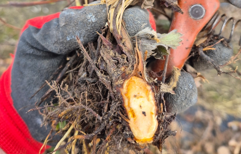W tym momencie lustracje powinny skupiać się nie tyle na częściach zielonych, ale raczej na szukaniu „dziury w całym”, znaczy się pod ziemią. Każda kwatera powinna być dokładnie przejrzana pod kontem kondycji systemu korzeniowego a dalej łodygi czyli tak zwanej korony. O ile same korzenie z reguły rozwijają się doskonale to problemy pojawiają się dale. Po pierwsze w uszkodzeniach wiązek przewodzących, po drugie przemarznięcia rdzenia korony który był magazynem substancji zapasowych do wykorzystania wiosną.