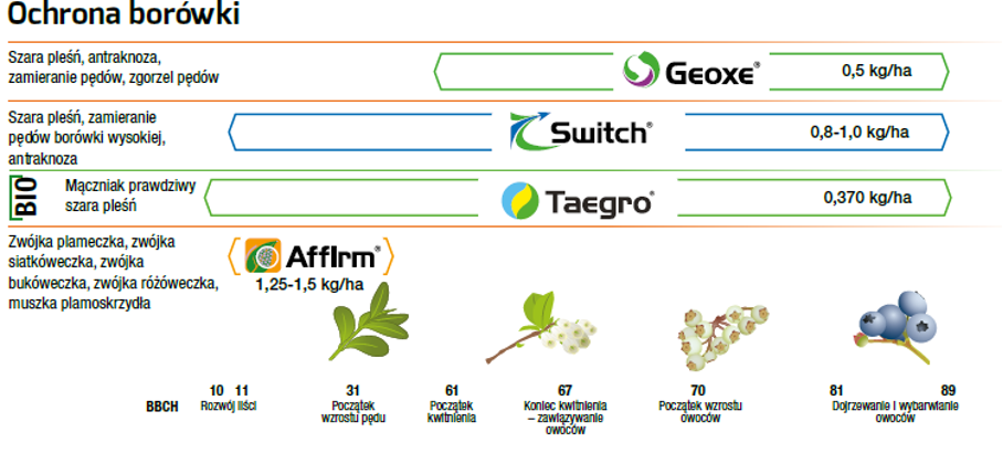 Proponowany schemat ochrony borówki przed chorobami i szkodnikami, z wykorzystaniem rozwiązań z firmy Syngenta