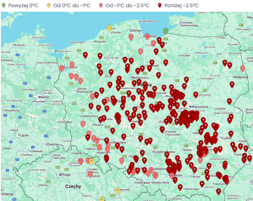 UMIARKOWANE ZAGROŻENIE (–1 do –3°C): Lubuskie, Dolny Śląsk, Pomorskie, Zachodniopomorskie, Kujawy
