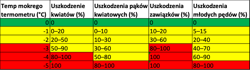 W tabeli można sprawdzić jakie są szacunkowe uszkodzenia poszczególnych części roślin w zależności od temperatury mokrego termometru. Prognozowane są przymrozki od -2,5°C do – 4,0°C. Oznacza to, że jest bardzo duże ryzyko uszkodzenia kwiatów i zawiązków owoców.