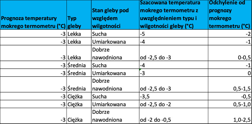 W tabeli można uzyskać informację jaka będzie szacunkowa temperatura mokrego termometru w zależności od typu gleby i jej wilgotności. Jak widać przy glebie lekkiej, suchej rzeczywista temperatura mokrego termometru może być nawet o 2°C niższa niż prognozowana. Z tabeli można również wyczytać jak duży wpływ ma wilgotność gleby. Wilgotna gleba zwiększa pojemność cieplną, poprawia przewodzenie ciepła oraz stabilizuje temperaturę