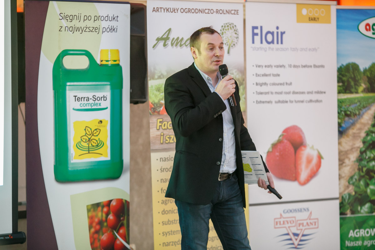 Maciej Lenkiewicz z firmy Arysta swoje wystąpienie rozpoczął od przedstawiania produktu Silwet, który jako adiuwant dodawany do cieczy roboczej w stężeniu 0,05% znacząco wpływa na poprawę skuteczności działania środków ochrony. Silwet Gold polecany jest jako dodatek do zabiegów insektycydów i herbicydów, które zazwyczaj mają działanie kontaktowe, a dodatek adiuwanty zapewnia równomierne pokrycie cieczą powierzchni roślin. Silwet Stik z kolei polecany do stosowania z fungicydami. Dodatek Silwetu który poprawia pokrycie, przyczepność i pobieranie cieczy, zapewnia zdecydowanie wyższą skuteczność stosowanych środków – podkreślał przedstawiciel Arysty. Vaxiplant SL to nowe podejście do ochrony truskawek, będący produktem o działaniu zbliżonym do szczepionek – mówił M. Leniewicz, podkreślając działanie tego preparatu polegające na wzmacnianiu odporności roślin na patogeny. Związane jest z tym konieczność zapobiegawczego stosowania produktu, które utrzymuje się przez 10-14 dni po zastosowaniu. Mówił też o biostymulatorach jak Asahi SL, Aminoplant, Calibra, Goemar BM 86 i Goteo, wartych zastosowania w uprawie truskawek. Nowym produktem w ofercie Arysta jest znany produkt Basamid 97 GR środek do odkażania gleby, w dawce 500 kg/ha. Duży wpływ na skuteczność działania tego produktu ma wymieszanie jego z glebą najlepiej na głębokość 30 cm, ważna jest też uwilgotnienie gleby co wpływa na jego właściwe działanie. Acaramik 018 EC to z kolei akarycydy oparty na abamektynie, polecany do zwalczania przędziorków. Select Super 120 EC, to herbicyd do zwalczania chwastów jednoliściennych które niszczone są już przy dawce 0,8 l/ha, podczas gdy przy zwalczaniu perzu konieczne jest zastosowanie dawki 2 l/ha.