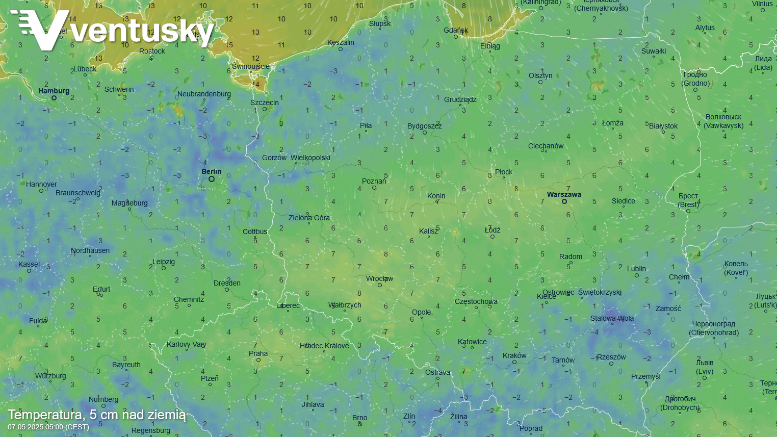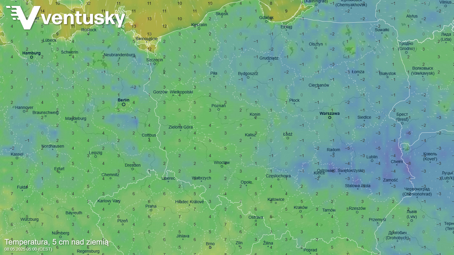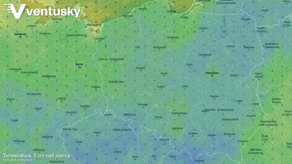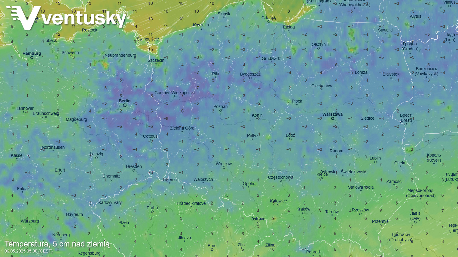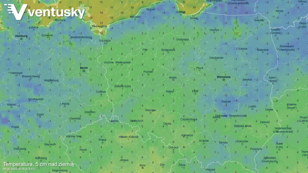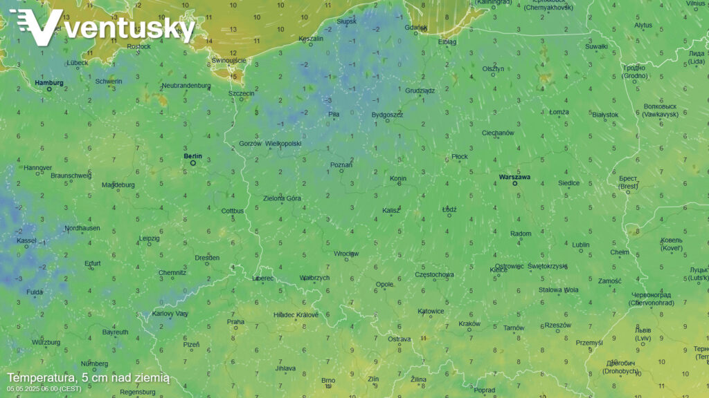 Noc z 5 na 6 maja zapowiada się jako najbardziej krytyczna – niemal w całej Polsce, z wyjątkiem południowych regionów, możliwe są przymrozki. Na wschodzie kraju temperatura przy gruncie może spaść nawet do -8°C.